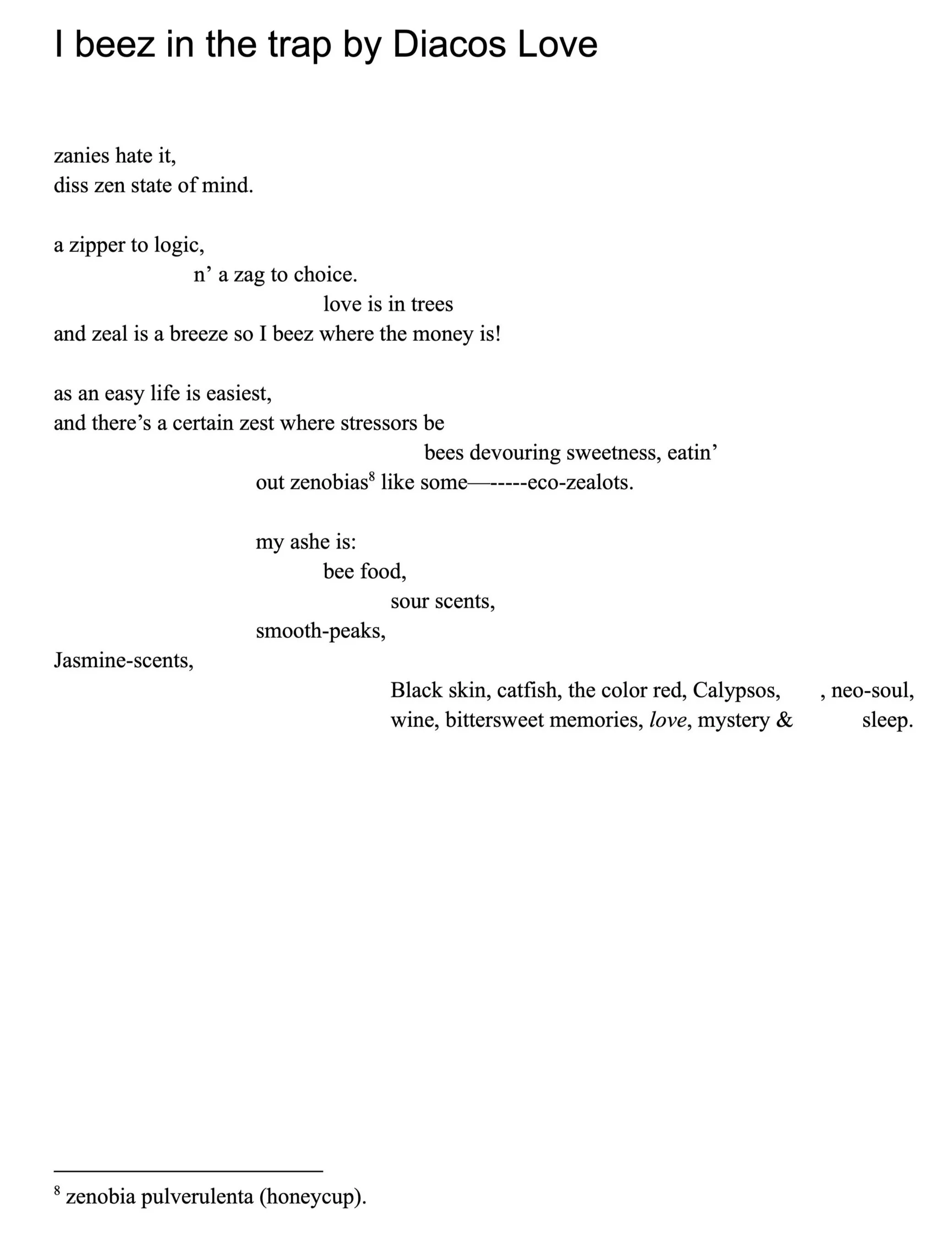 Diacos Love was a student at Oberlin College who enjoys singing, eating good food, and writing funny things.